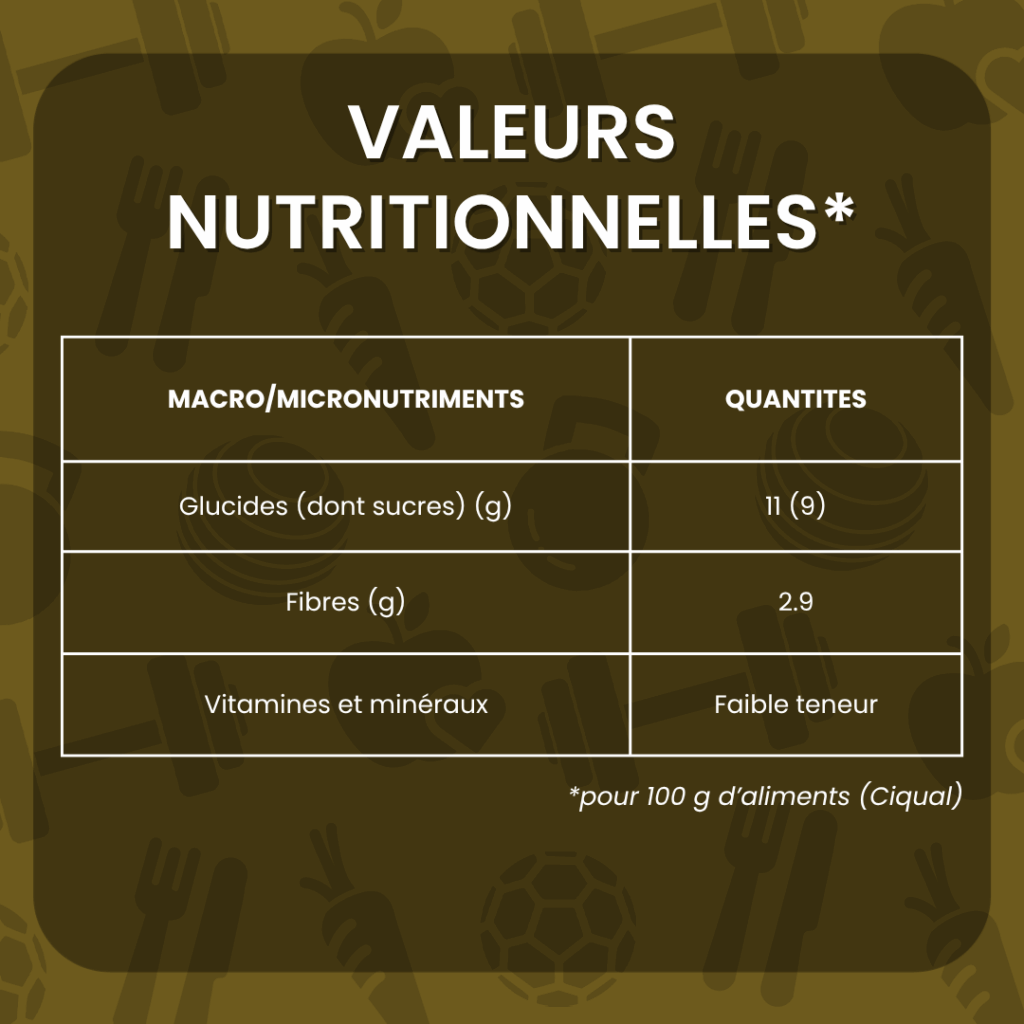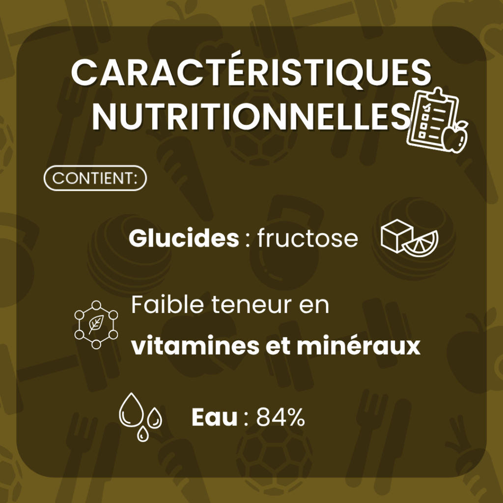 ⚠️ Peu de vitamines/minéraux → à compléter avec d’autres fruits ou légumes pour un apport en micronutriments optimal.