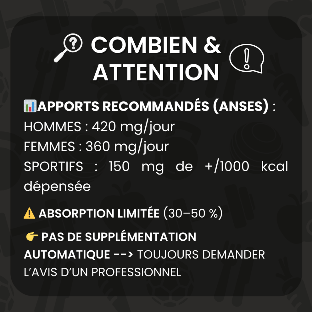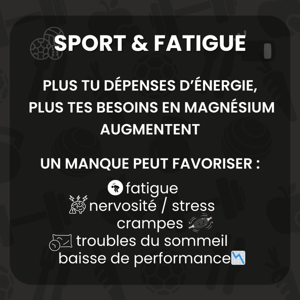 Chez le sportif et les personnes actives, les besoins augmentent avec la dépense énergétique. Un apport insuffisant peut entraîner fatigue, crampes, nervosité, troubles du sommeil et baisse de performance 😴😵💫