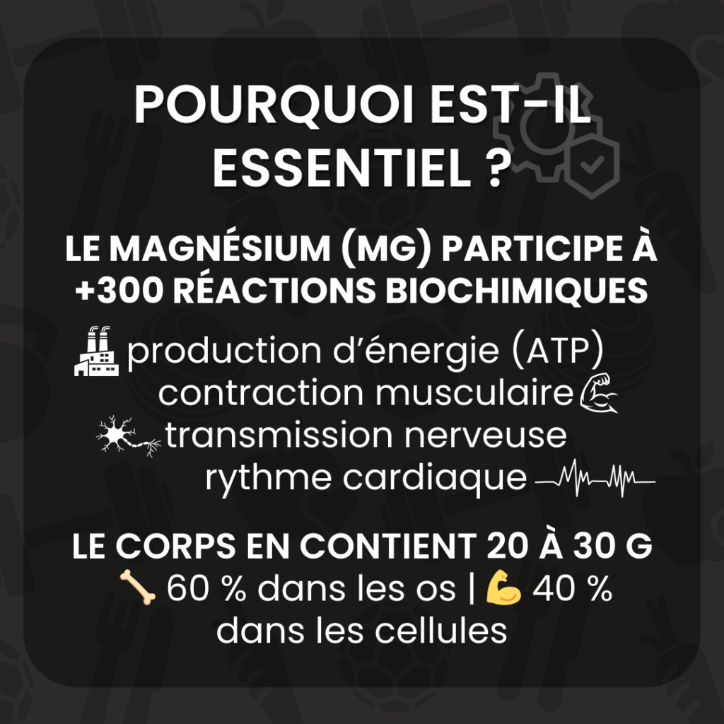Le magnésium (Mg) est un minéral essentiel impliqué dans +300 réactions biochimiques. Il joue un rôle majeur dans la production d’énergie (ATP), la contraction musculaire, la transmission nerveuse et la régulation du rythme cardiaque ⚡🫀