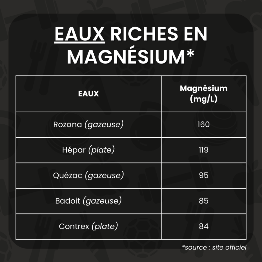 💧 Eaux minérales : Rozana (~160 mg/L), Hépar (~119 mg/L), Contrex (~84 mg/L)